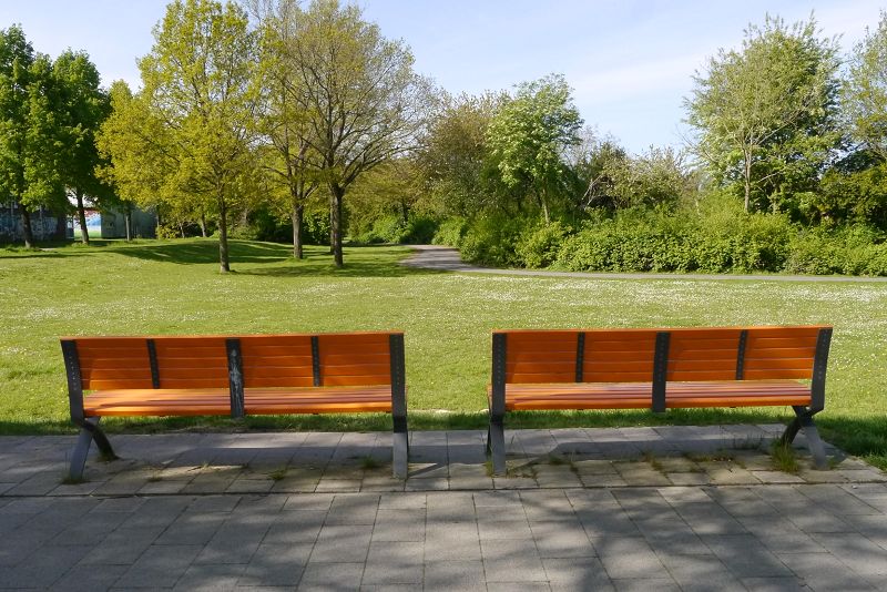 Das Foto zeigt Bänke mit Weitblick über eine Rasenfläche entlang der Grünachse - Datei öffen/herunterladen (JPG, 117.9 KB)