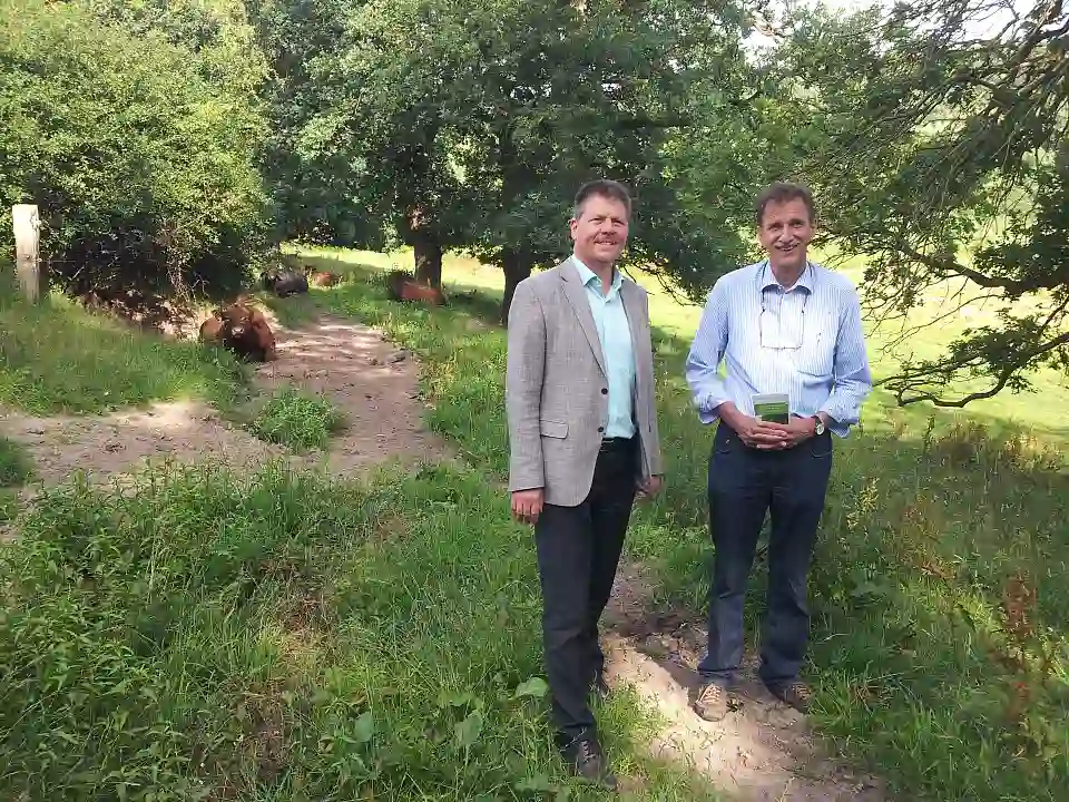 Senator Joachim Lohse mit Biolandhof-Besitzer Ullrich Vey auf dessen Wiesen