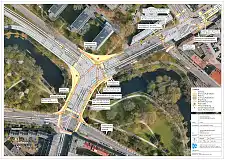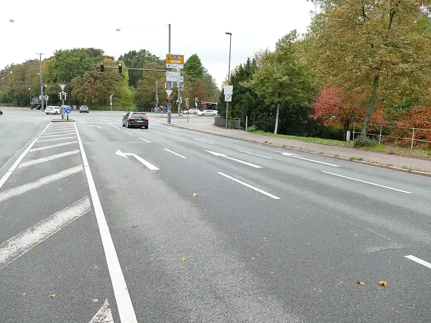Breite, teils mehrspurige Verkehrsanlagen mit großen Radien und ein besonderer Bahnkörper für die Straßenbahn prägen das Bild am Knoten.