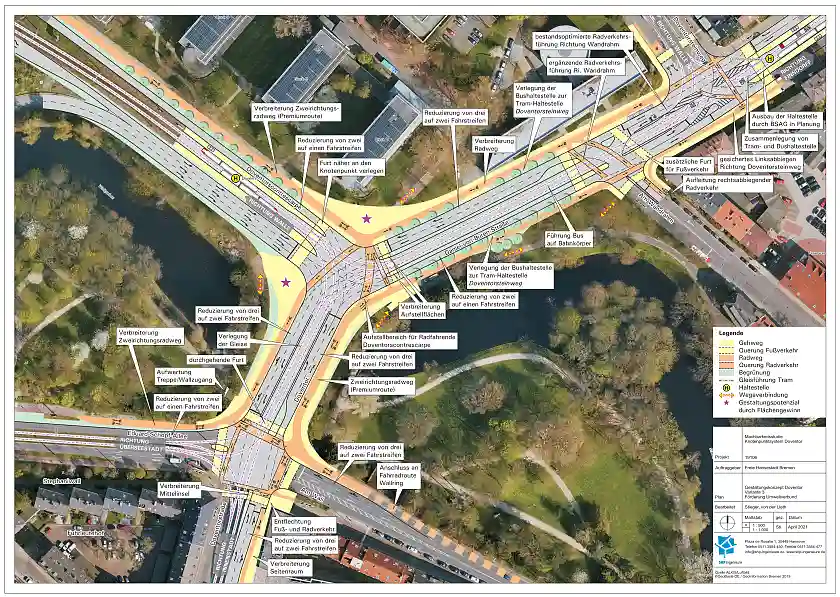 Auch im Rahmen des Integrierten Verkehrskonzepts Überseestadt (IVK Überseestadt, Senatsbeschluss vom 30. Oktober 2018) wird der schon im VEP 2025 dargestellte Handlungsbedarf zum Umbau des Kreuzungsbereichs Doventorscontrescarpe / Daniel-von-Büren-Str. / Doventor aufgegriffen (Maßnahme R.12 im IVK Überseestadt).
