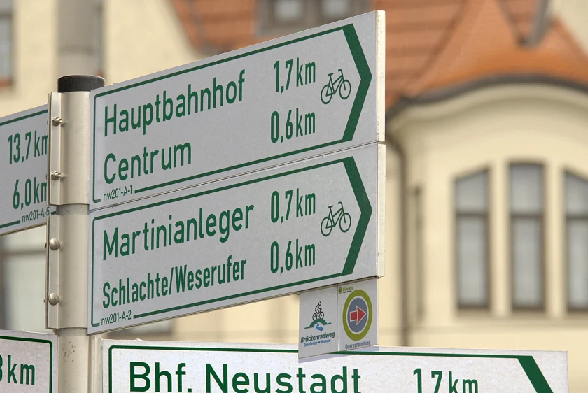 Eine (fast) vollständige Wegweisung führt Radfahrerinnen und Radfahrer auf direkten und attraktiven Routen durch Bremen und sorgt mit einer gut lesbaren Beschilderung für eine einfache und schnelle Orientierung.