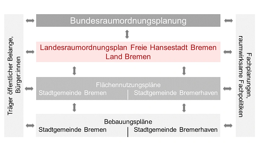 Die kommunale Bauleitplanung umfasst für das gesamte Gebiet einer Stadtgemeinde die vorbereitende Bauleitplanung durch einen Flächennutzungsplan und für räumliche Teilbereiche einer Stadtgemeinde eine verbindliche Bauleitplanung durch Bebauungspläne. Die Flächennutzungspläne der Städte Bremen und Bremerhaven und die Bebauungspläne in den beiden Stadtgemeinden müssen die Festlegungen des zukünftigen Landesraumordnungsplans des Landes Bremen berücksichtigen bzw. beachten. Im Gegenzug ist die Bauleitplanung bei der Aufstellung von Raumordnungsplänen zu berücksichtigen.